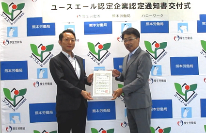 熊本労働局より基準適合事業認定通知書を受け取りました。